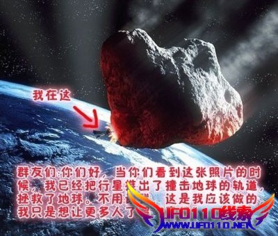 (图中文字:群友们你们好,当你们看到这张照片时候,我已经把行星退出了撞击地球的轨道,拯救了地球,不用谢我,这是我应该做的,我只是想让更多人了解“真相”)