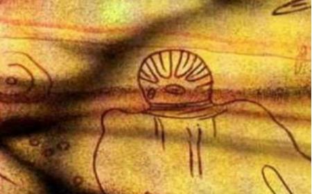一幅非洲洞穴画描绘了一个有着天线头在空中飞翔的物种。它有一双大大的黑色斜眼,薄薄的嘴唇,怀里抱着一只动物。