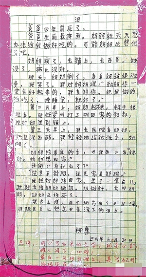 “爸爸四年前死了……妈妈病了,去镇上,去西昌,钱没了,病也没好。我去给妈妈做饭,饭做好,我去叫妈妈,妈妈已经死了。”近日,一篇被称为“世界上最悲伤的小学作文”在网上热传。这篇字字泣泪的作文,让无数网友为之动容。(新京报)